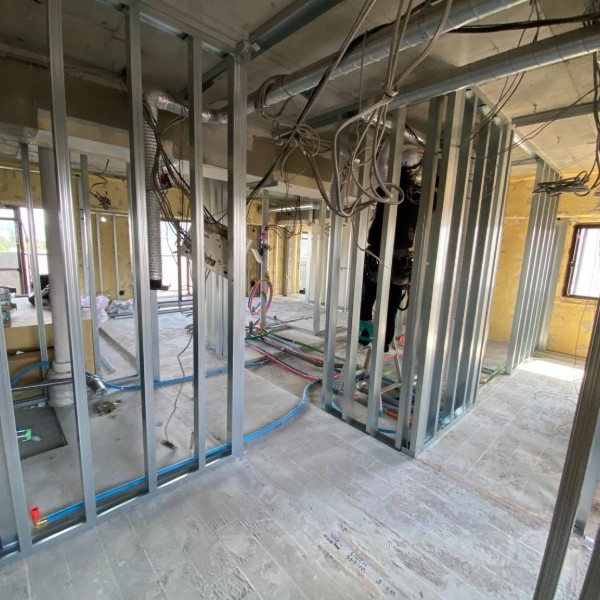 前回、間仕切りの墨出しをした通りに壁が起きていき、段々と部屋の形が見えて来ました。