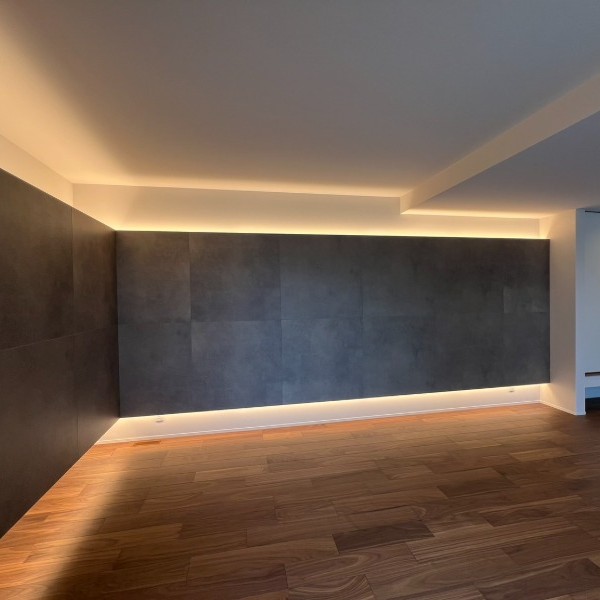 光が壁を這うように広がることで、面の存在感を際立たせつつ、視覚的に天井高を感じさせる効果もあります。