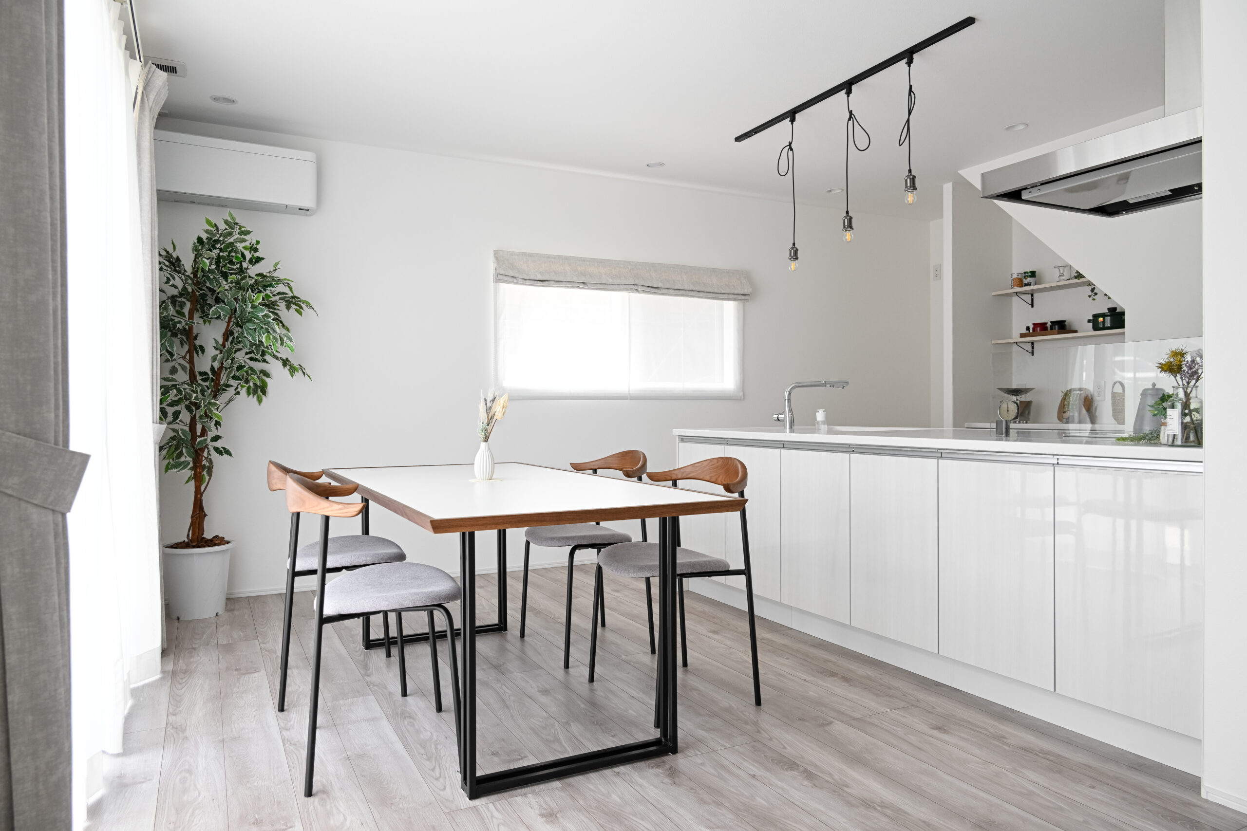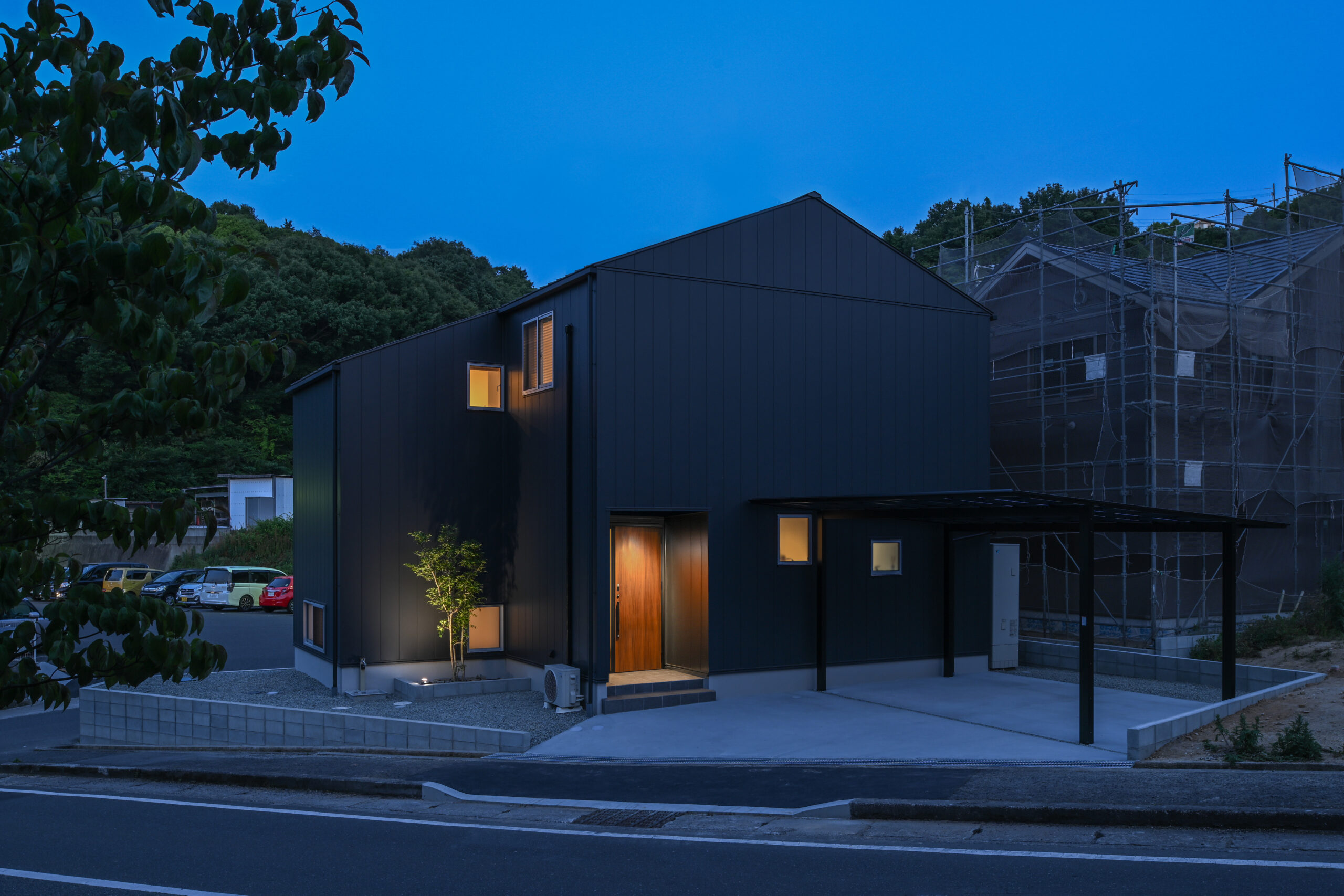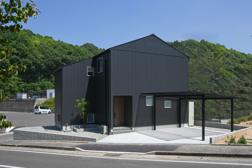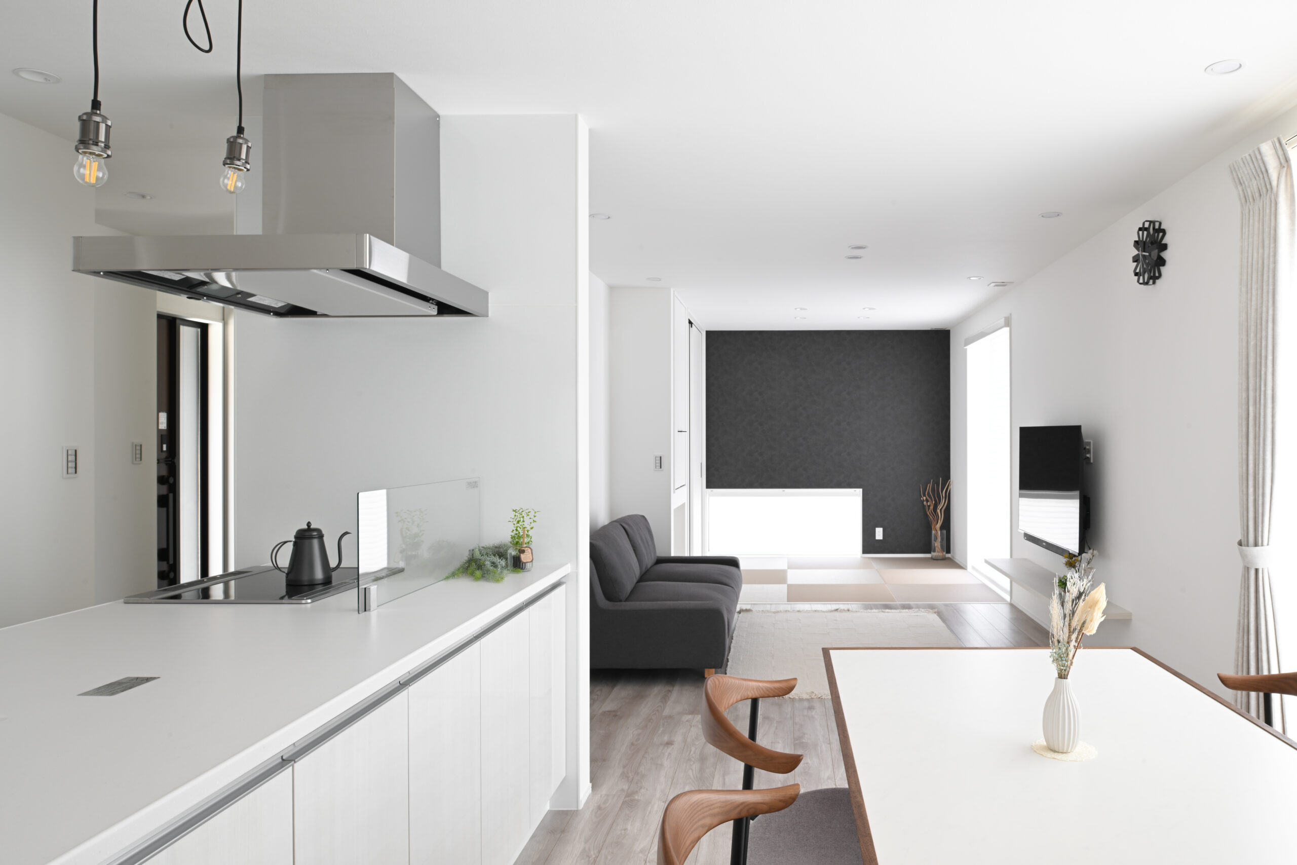 外壁にはガルバリウムを採用。 耐久性に優れているため、メンテナンスコストはおよそ2分の1。 ブラックでキリッと引き締めた外観と、ホワイトで統一された内観とのギャップに魅せられます。 回遊動線や、コミュニケーションの取りやすさがメリットのペニンシュラキッチンも採用し、開放感のあるLDKを実現しました。
