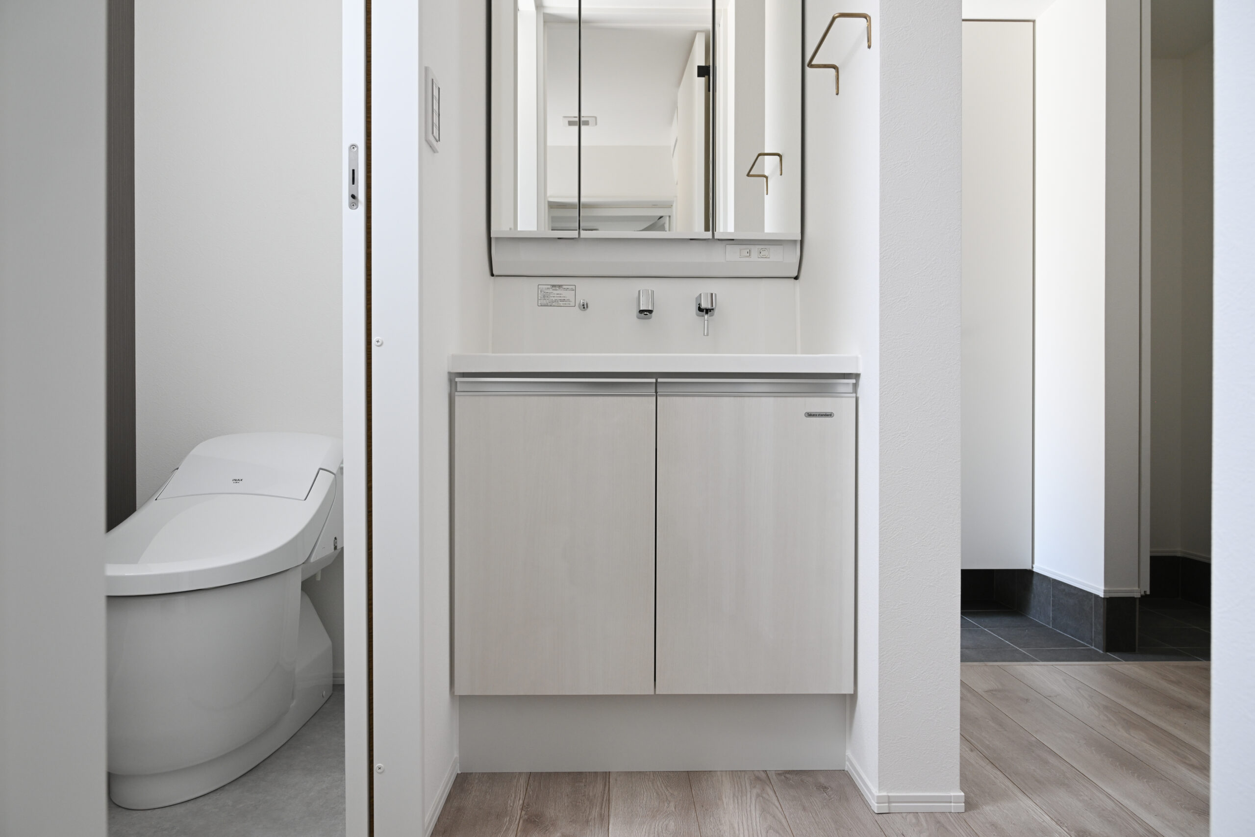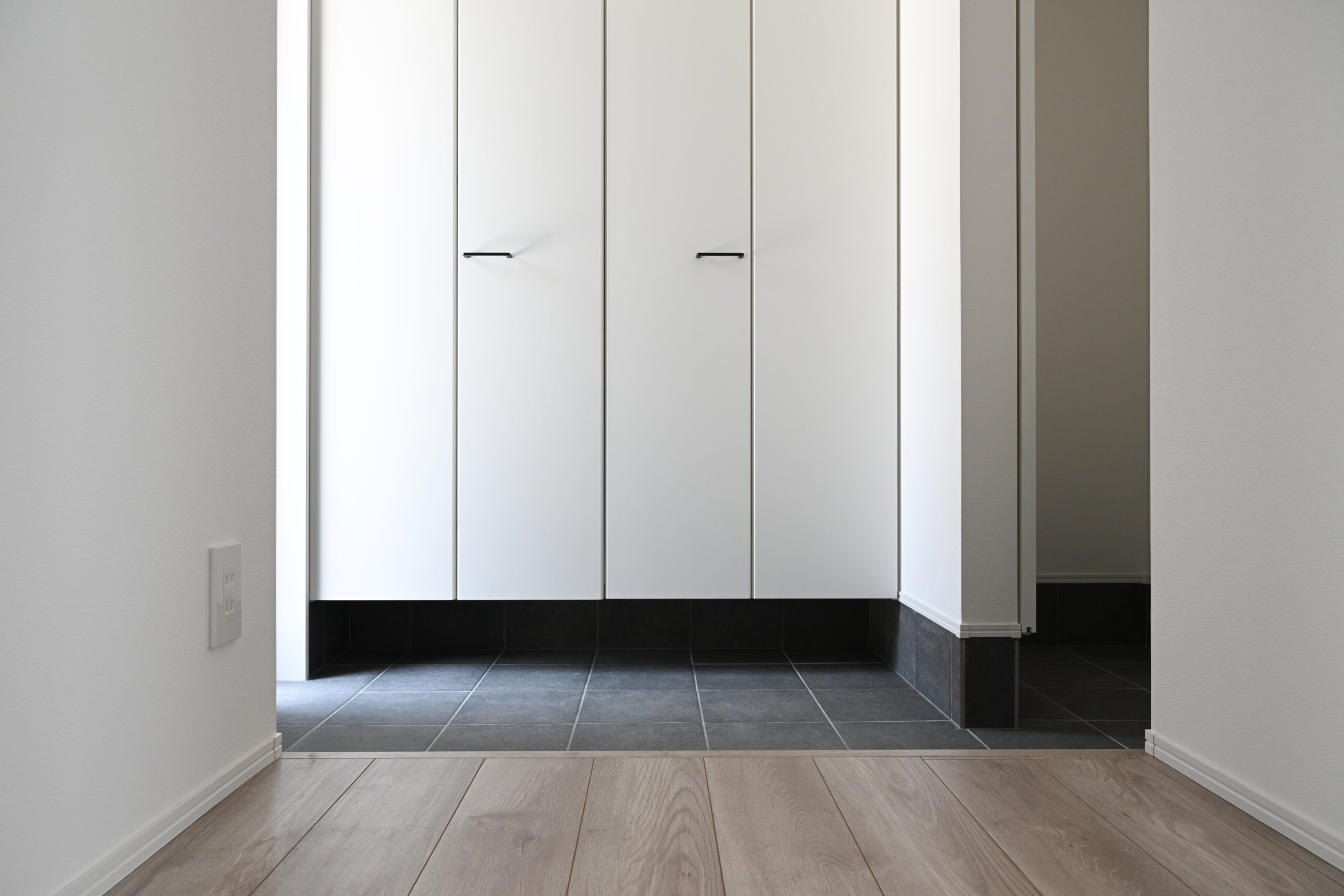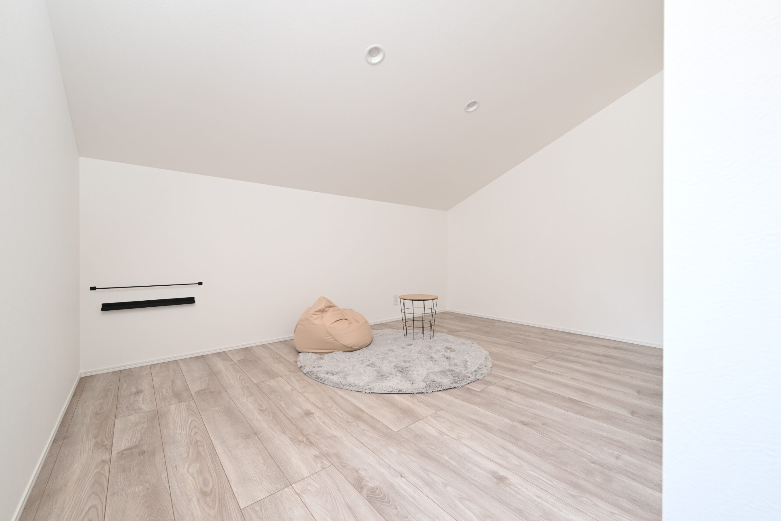 外壁にはガルバリウムを採用。 耐久性に優れているため、メンテナンスコストはおよそ2分の1。 ブラックでキリッと引き締めた外観と、ホワイトで統一された内観とのギャップに魅せられます。 回遊動線や、コミュニケーションの取りやすさがメリットのペニンシュラキッチンも採用し、開放感のあるLDKを実現しました。