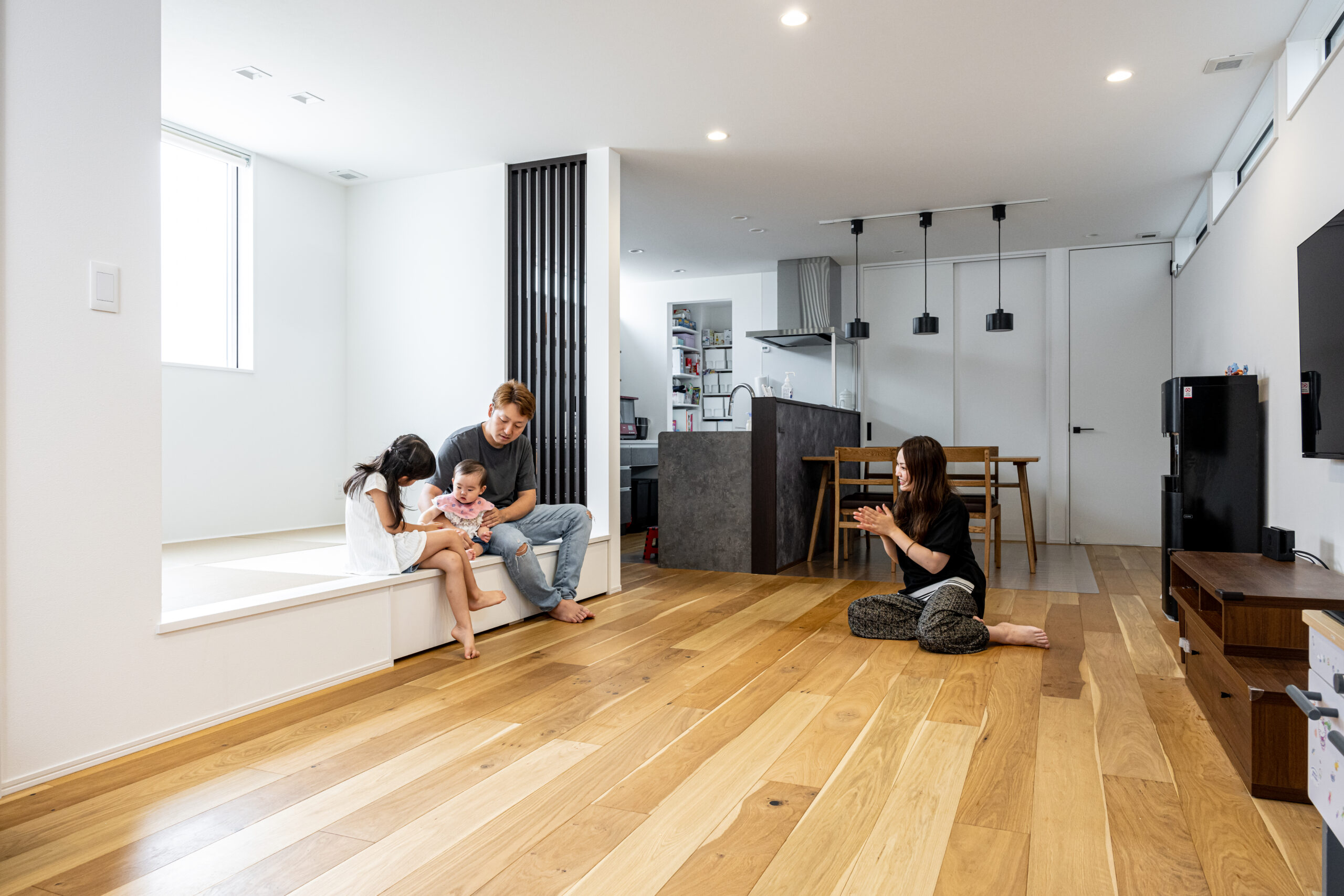 人気エリアでの注文住宅では、土地の形や大きさが限られています。細長い敷地に建築したお家のこだわりは、プライバシーを保つ格子を設置した中庭です。 採光が部屋に上手く取り込むことができるだけではなく、「子どもが安心して遊べる場所」や「カーテンを閉めなくても外から見えない」といった防犯面でも安心感が生まれます。 それに加え、オープン階段や小上がりのタタミコーナーのこだわりも叶えたお家が誕生しました。