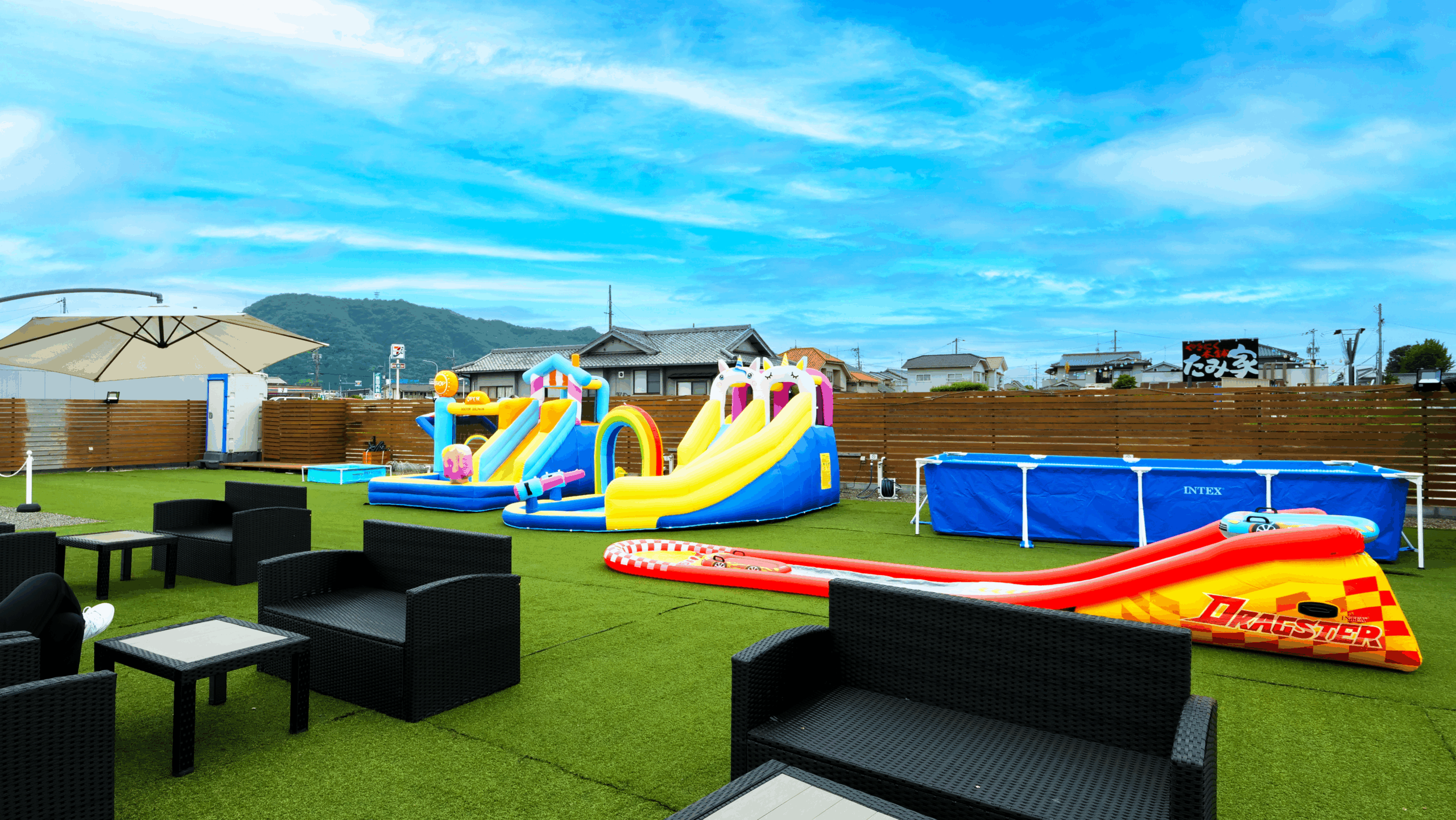 施設内で飲食OK!スペース内にはパラソル付きのテーブルセットをご用意しています。